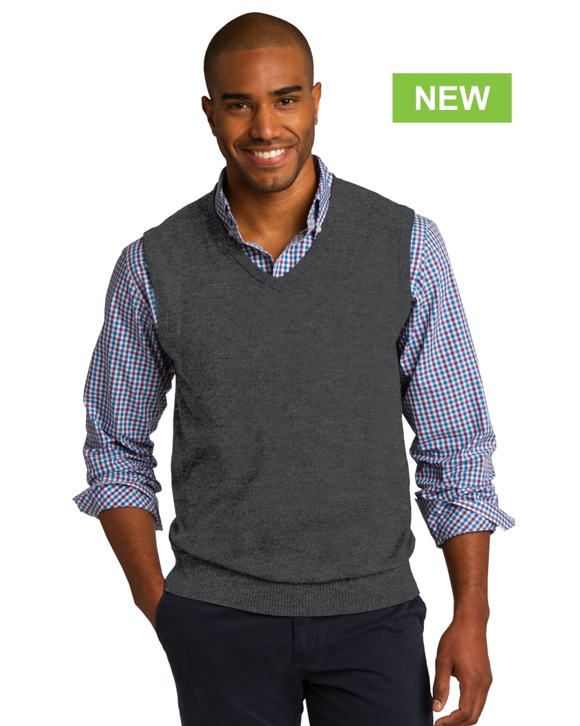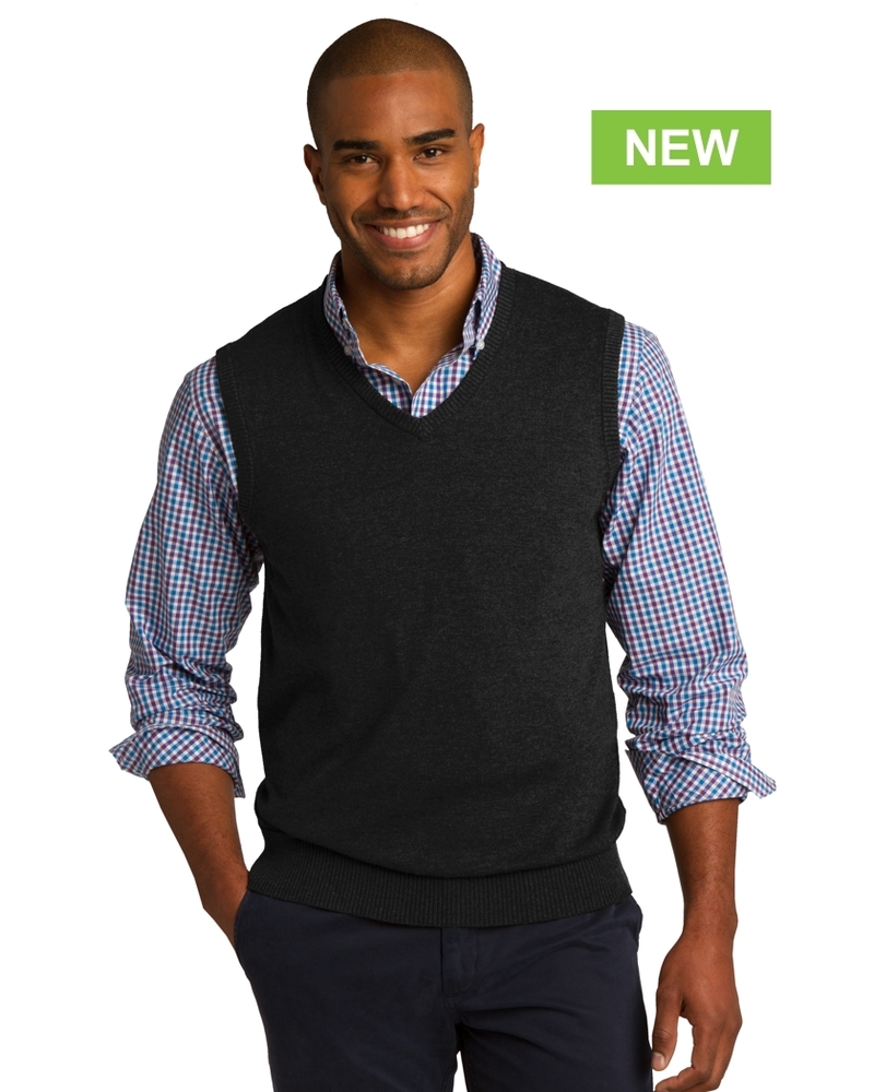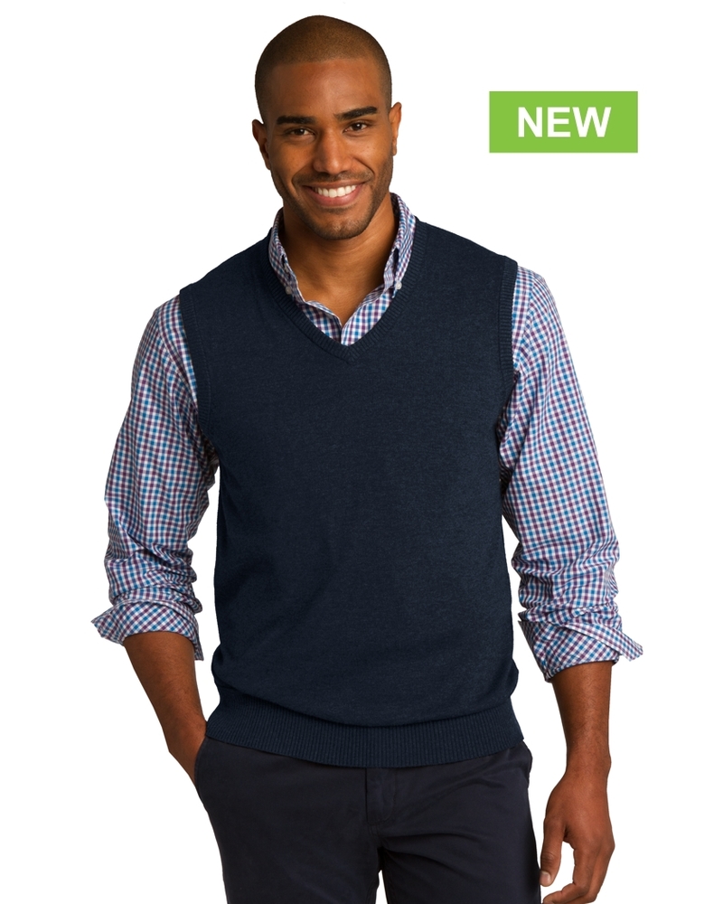 Span the divide between dressy and casual with this versatile v-neck sweater vest that pairs easily with slacks or jeans. 60/40 cotton/nylon. Rib knit v-neck, armholes and hem.