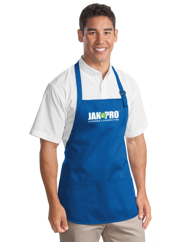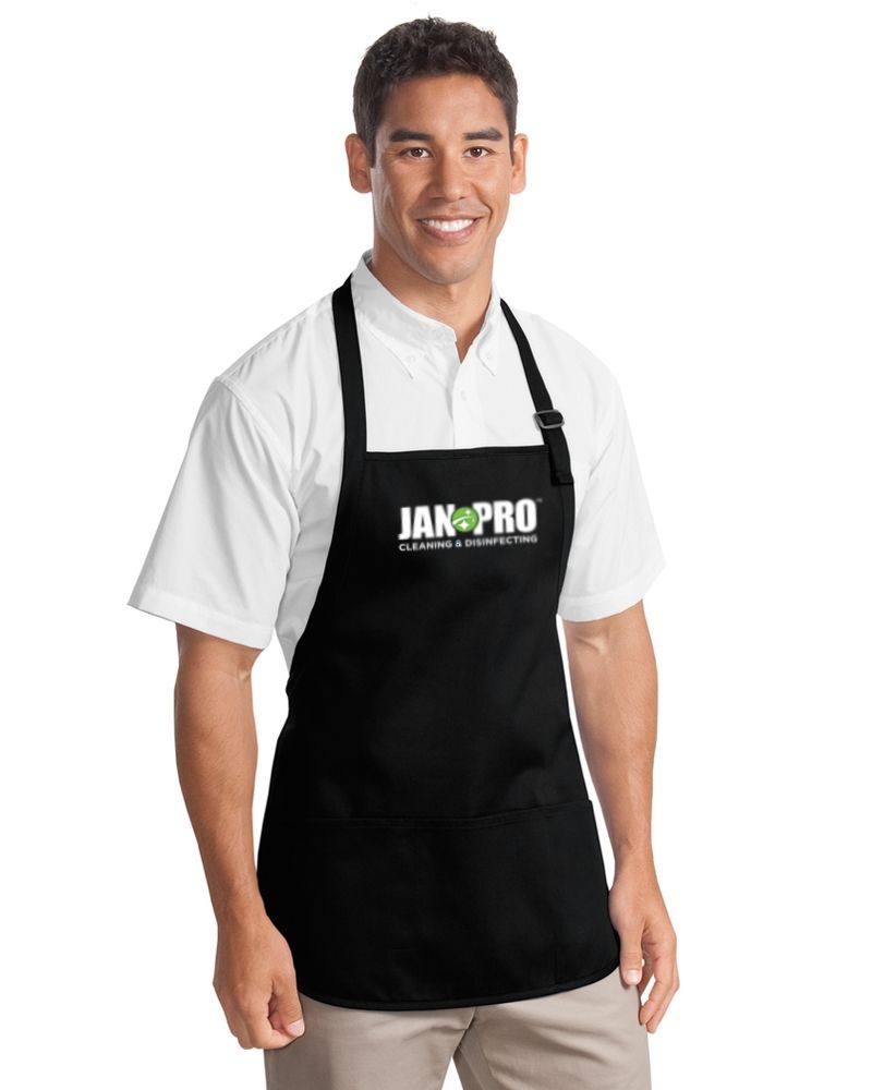 Improved quality Medium Length apron. 7-oz. 100% cotton twill with Stain-Release protection. Adjustable neck strap with buckle. Waist side ties. Three section front pouch pockets along with pen pocket. 22" wide x 24" long.