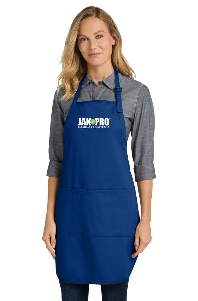Protect your clothes in our full-length stain-release apron. Now heavier in weight than our previous apron. Wrinkle resistant apron made from 65% ployester and 35% cotton twill with Stain Release protection. Adjustable neck strap. Three front pockets. 22" wide x 30" long.