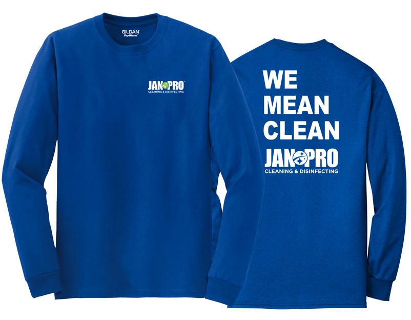 Printed with new 2-color logo on Left Chest and We Mean Clean/Jan-Pro logo printed on Back.